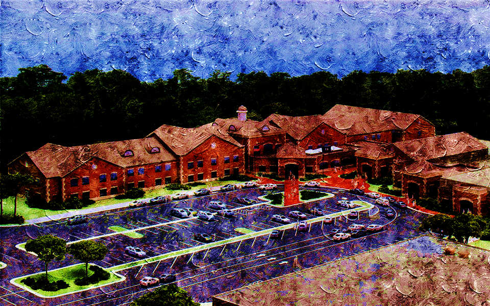 校内遍布砖式建筑,被大片树林所围绕。